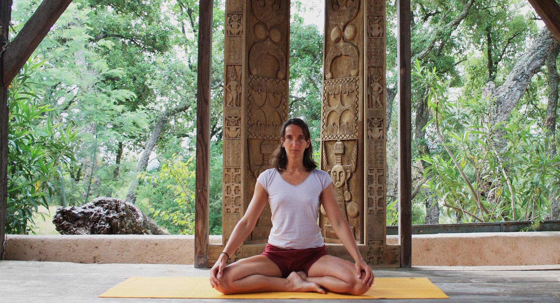 Sur cette photo, je suis assise en position de lotus, une posture emblématique qui favorise la méditation et le centrage intérieur. Autour de moi, la nature s'étend paisiblement, capturant l'essence même de la tranquillité que j'aspire à transmettre aux élèves. Cette image a été prise à Trimurti dans le Var, un lieu animé par d'innombrables stages de yoga et de développement personnel,