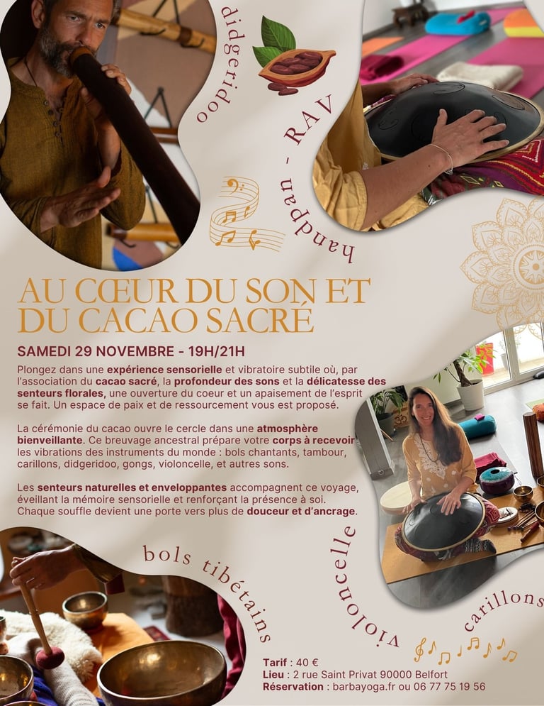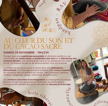 Plongez dans expérience sensorielle et vibratoire où l'association du cacao sacré, la profondeur des sons, et la délicatesse des senteurs florales vous offre un espace de paix et de ressourcement.