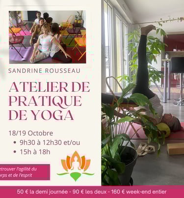 J'ai l'honneur d'accueillir exceptionnellement ces week-ends Sandrine Rousseau, mon enseignante de yoga Iyengar, pour deux journées spéciales. Avec une riche expérience de 25 ans, Sandrine partagera son savoir-faire lors de ces week-ends. Sous le thème "Retrouver la souplesse et l'agilité du corps et du mental", ces ateliers offriront une immersion profonde dans les techniques du Yoga Iyengar, ouvrant la voie à une exploration enrichissante de la flexibilité et de l'équilibre mental.