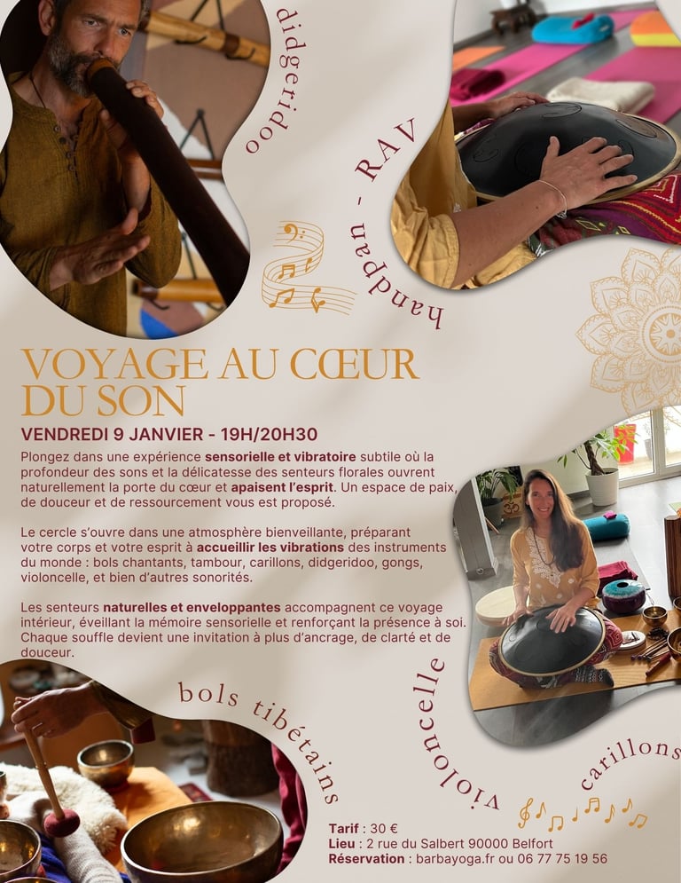 En collaboration avec Christelle Beaussier et Stéphane Olry, nous vous proposons des séances de yoga sonore uniques en leur genre, où vous plongez dans un voyage de détente profonde et de connexion intérieure. Ces séances innovantes combinent les bienfaits apaisants du yoga avec les vibrations harmonieuses des instruments tels que les bols tibétains, le didgeridoo, les bols japonais au cristal thérapeutique, les Gong, Kalimba et Koshi. Nous saurons vous faire voyager avec les divers instruments proposés.