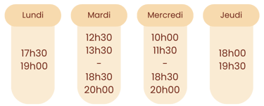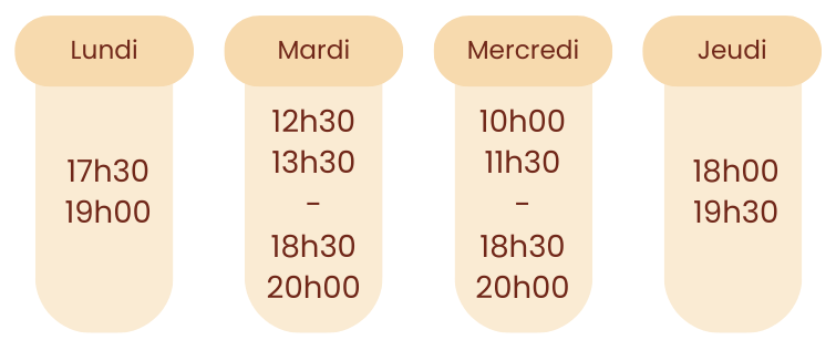 Pour les horaires disponibles en cours particulier, il suffit de m'appeler et nous voyons ensemble un horaire qui convient mutuellement.