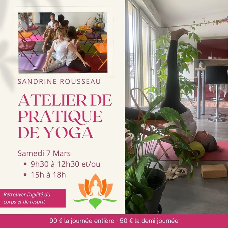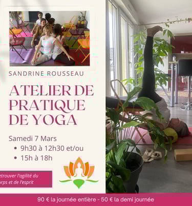 J'ai l'honneur d'accueillir exceptionnellement ces week-ends Sandrine Rousseau, mon enseignante de yoga Iyengar, pour deux journées spéciales. Avec une riche expérience de 25 ans, Sandrine partagera son savoir-faire lors de ces week-ends. Sous le thème "Retrouver la souplesse et l'agilité du corps et du mental", ces ateliers offriront une immersion profonde dans les techniques du Yoga Iyengar, ouvrant la voie à une exploration enrichissante de la flexibilité et de l'équilibre mental.